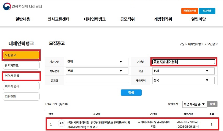 196공무원동남지방데이터청(동남지방데이터청_진주) 대체인력뱅크 인력풀(한시임기제 공무원 9호) 모집 공고